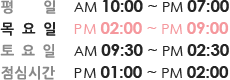 토요일 진료시간 변경안내 페이지 정보 작성자 봄날애 작성일15-11-23 10:47 조회19,164회 댓글0건 관련링크 이전글 목록 본문 토요일 진료시간 변경안내 토요일 진료시간이 오전 9시 30분부터 오후 3시까지로 변경되었습니다.(점심시간 없음) 참고하시어 방문과 예약에 착오 없으시기 바랍니다.감사합니다. 답변목록 등록된 답변이 없습니다. 이전글 목록